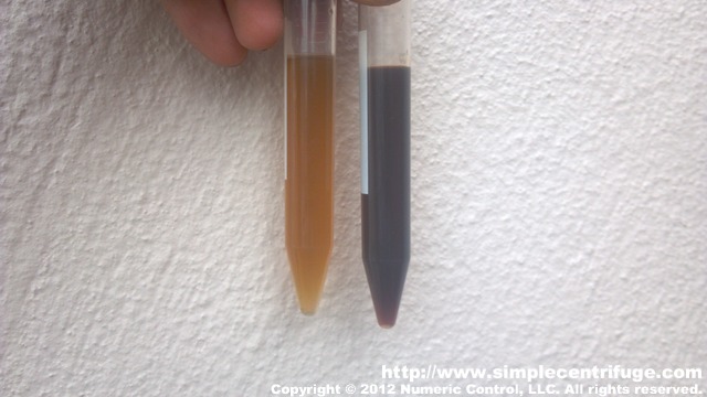 Distilled ATF on the left. A sample of the ATF on the right. Glad that didn't come out of my transmission. You can see some debris in the distilled ATF which is likely residue from earlier tests in the distillation unit.