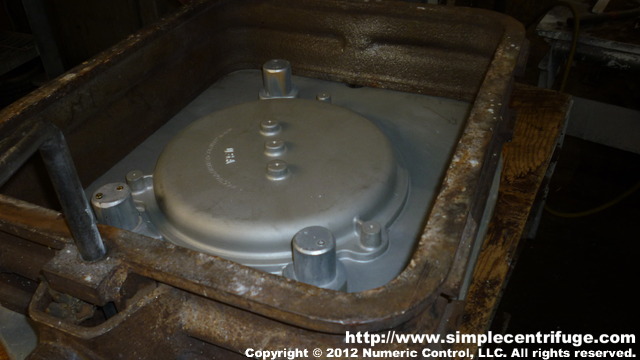 Lid pattern in flask before adding sand. Note the large risers and grates are incorporated into the pattern.
