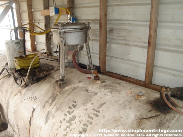 Yellow line is incoming hot oil from the heater. Red hose is the clean oil going to the 3000 gallon storage tank. The white hose is the inner sump drain which is directed to a bucket. This drains off any small amount of oil that may collect around the motor shaft. Note that the motor is dry. Copper lines leaving thank feed a furnace. |
